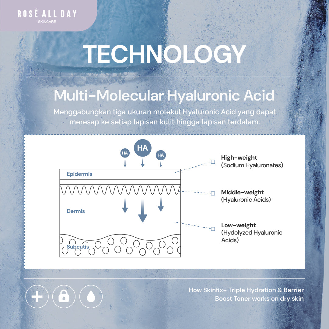 Terdiri dari Multi-Molecular(*) Hyaluronic Acid (Hyaluronic Acid, Sodium Hyaluronate, Hydrolyzed Hyaluronic Acid) yang berfungsi sebagai Super-Hydrator untuk:
