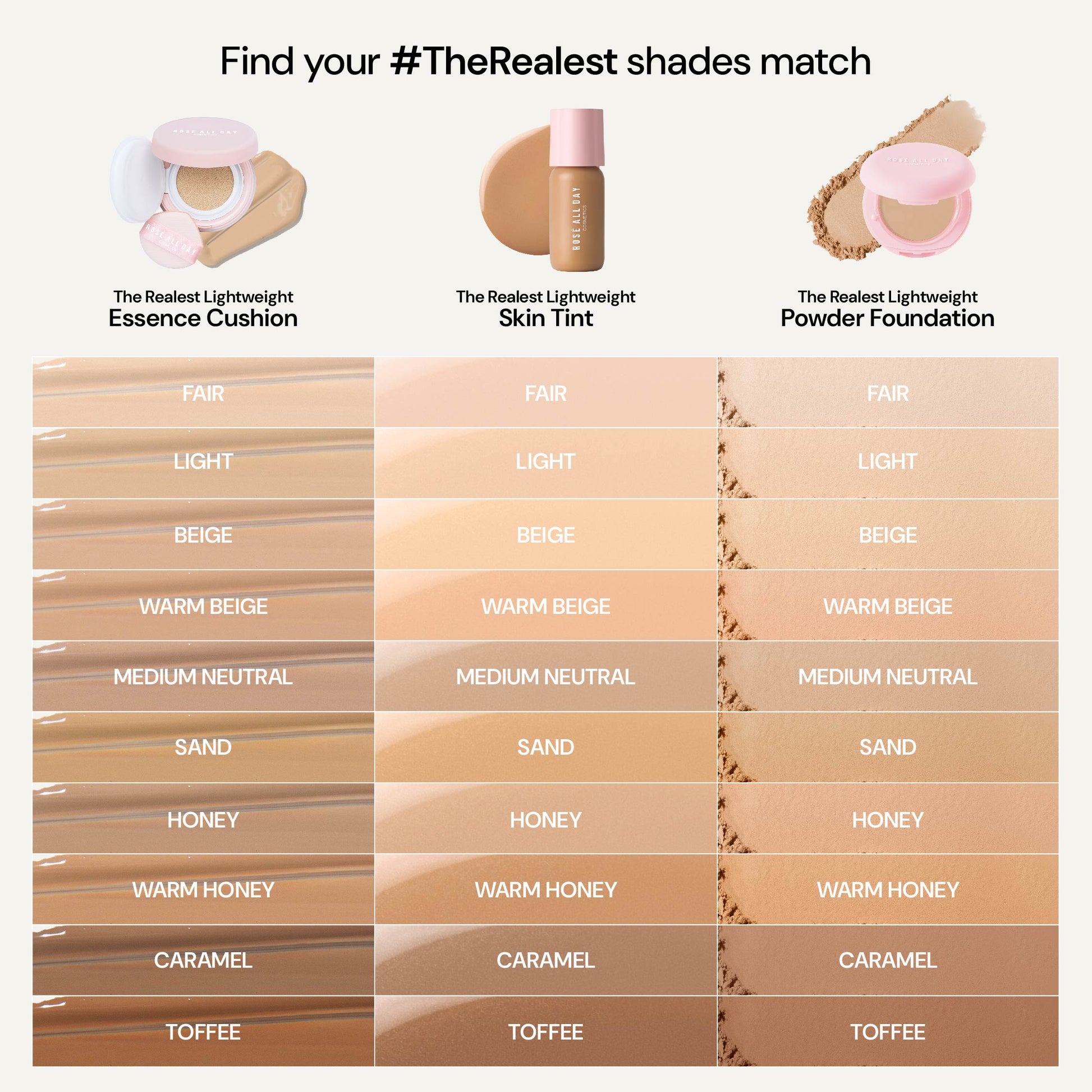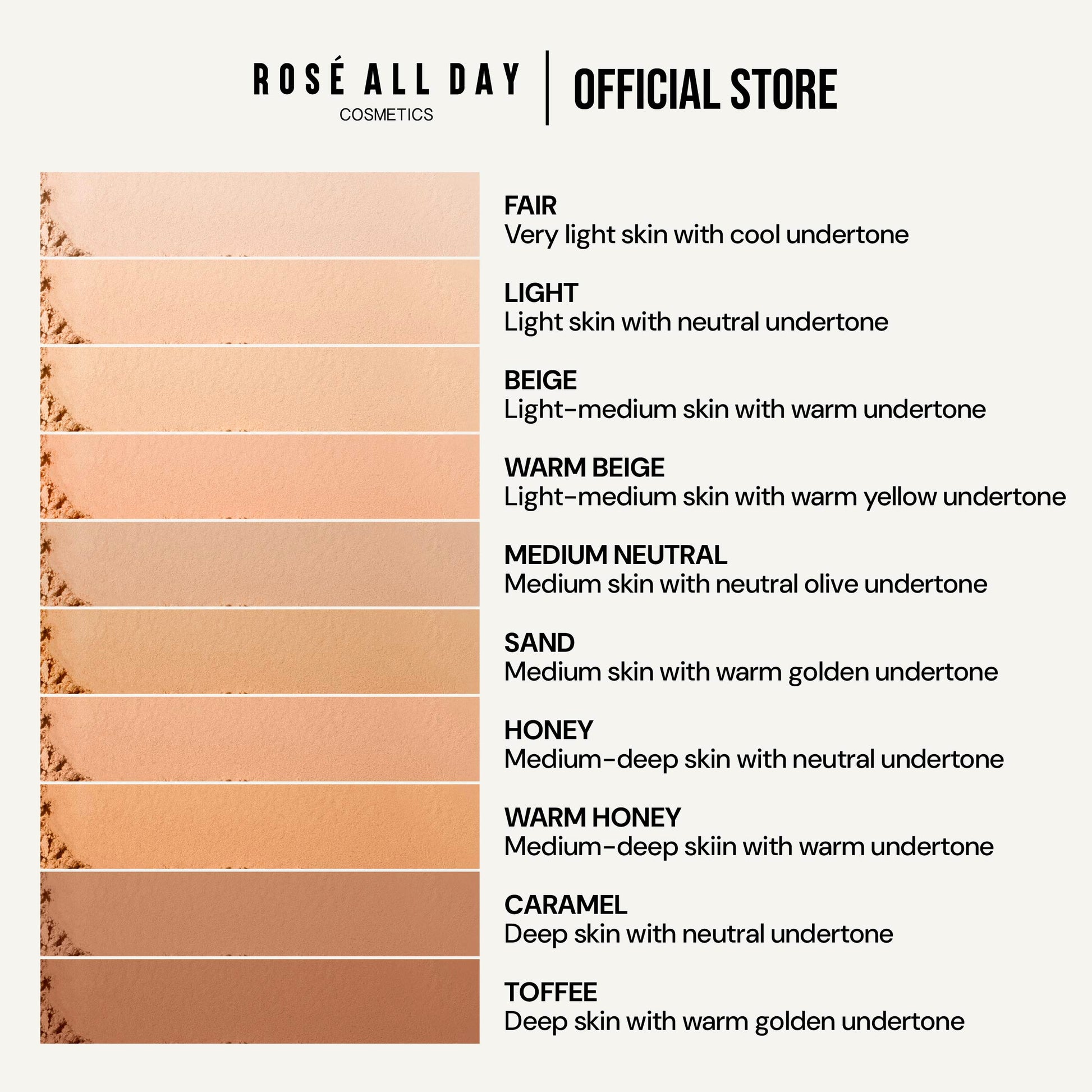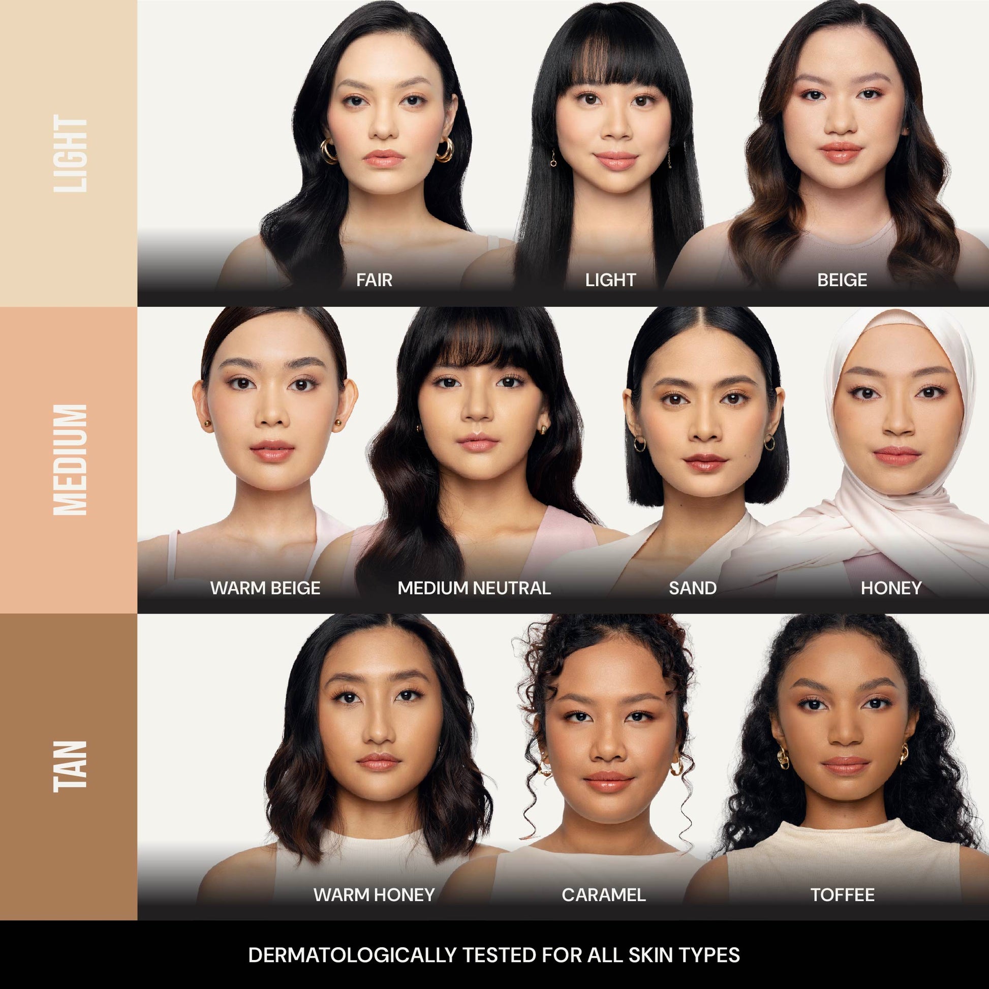 Available in 10 shades : Fair, Light, Beige, Warm Beige, Medium Neutral, Sand, Honey, Warm Honey, Caramel and Toffee
