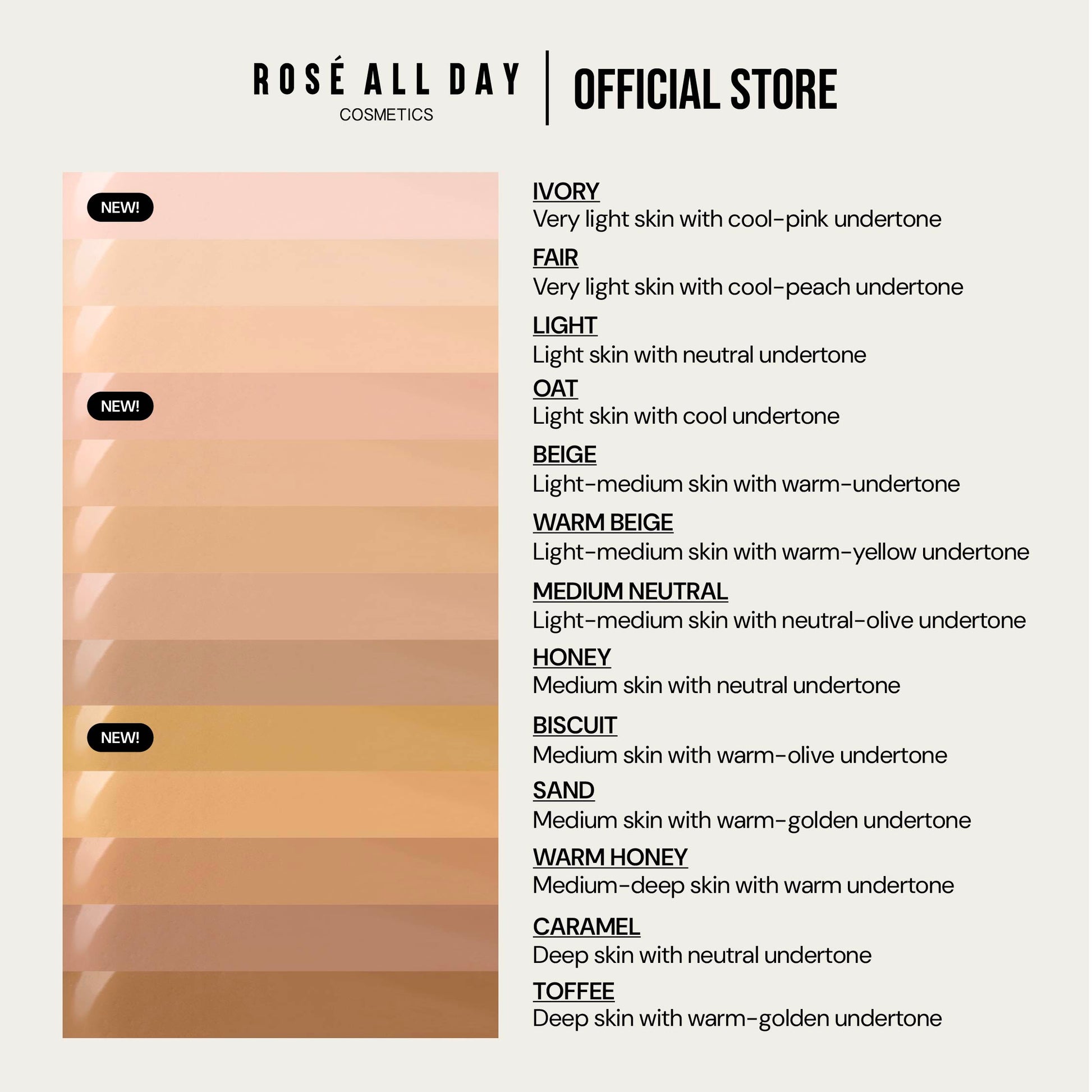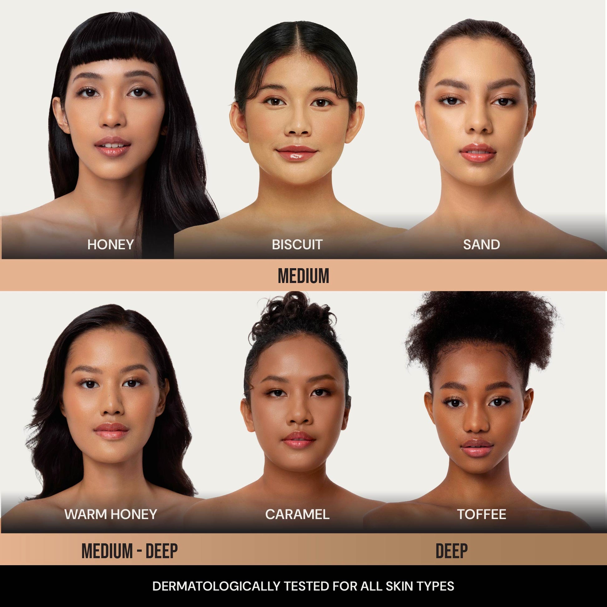 Now available in 13 shades: Ivory (NEW), Fair, Light, Oat (NEW), Beige, Warm Beige, Medium Neutral, Honey, Biscuit (NEW), Sand, Warm Honey, Caramel and Toffee.